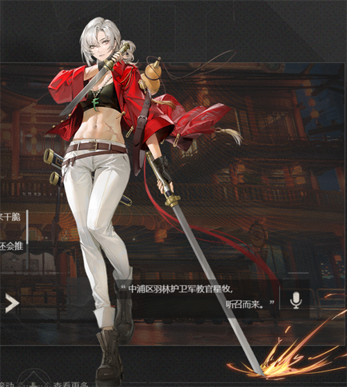”羽林护卫军“中手持唐刀、英姿飒爽的女教官。她的战斗风格向来干脆利落、简单粗暴,就像她的性格一样直爽明快。工作之外,星牧也对养生颇有研究,腰上常备一壶温热养生茶,还会推拿按摩。