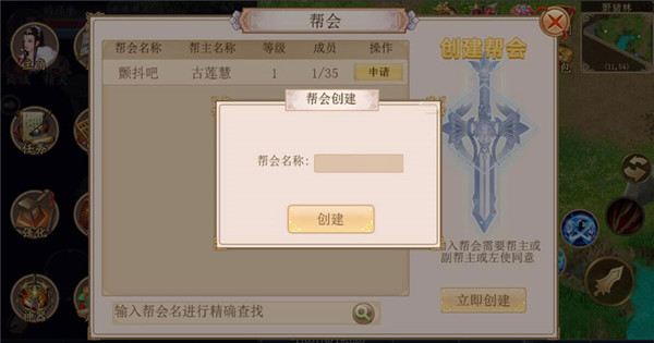 【创建帮会】当玩家级别到达20级时,可以在帮会界面建立属于自己的帮会,建立帮会时需要提供道具“帮会帮主印玺”。(可在商店和商城中购买获得得到)。
