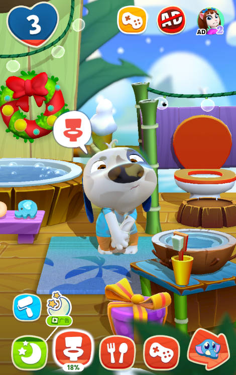 4、有时汉克狗需要上厕所,马桶图标会亮起红色,玩家只需点击马桶即可让它解决。用完之后,马桶图标会恢复成黄色,表示它已经舒适地完成了任务。