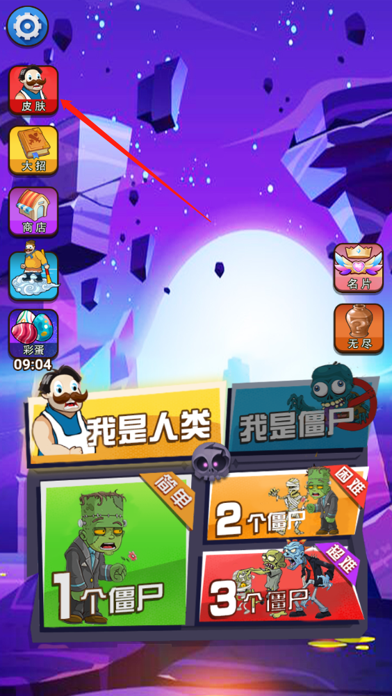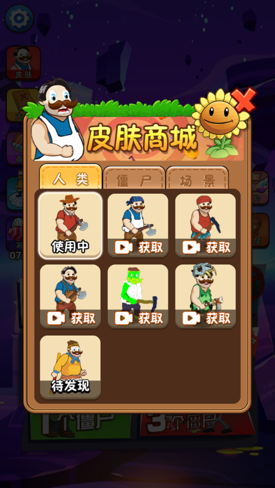 3、这里的皮肤分为人类、僵尸、场景这三种,每种都有很多的皮肤,由于本款游戏是免广告版,玩家无需查看广告即可领取皮肤;