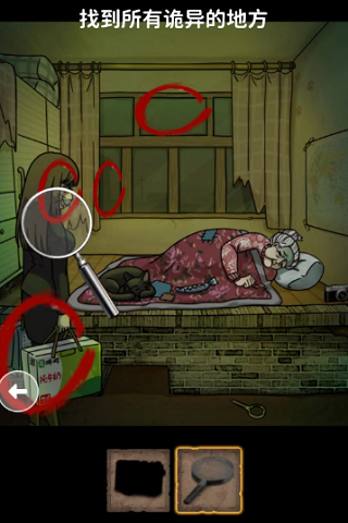3、之后是放大镜,玩家拿着放大镜在图片中观察, 可以找到下图的四个位置,记得要把放大镜移动过去才可以点。