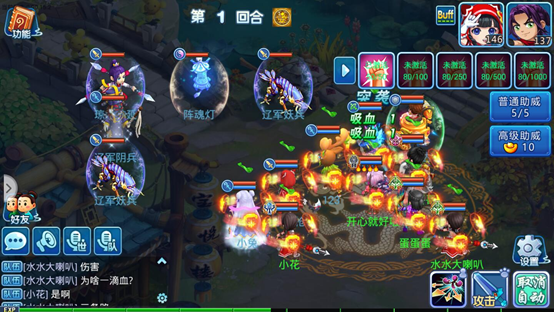没错,这个玩法有观战系统,实力不足的玩家们可以选择观战,然后给出战的队伍助威。助威次数达到一定程度,可以触发增伤buff,最多为增伤200%。可以看到上图右上角的指令,破阵脚时,其他人可以给予5次普通助威(无消耗)和3次高级助威(10元宝/次)。助威本身不仅能获得战斗参与奖励,还能额外获得助威奖励。相应的,上场的队伍除了战斗参与奖励外,可以获得击杀阵脚的高级奖励。