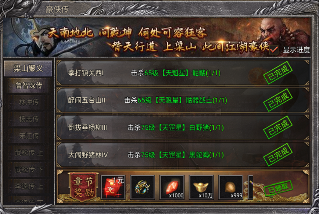 江湖豪侠传共有五大剧情,每章剧情下有多个小节任务。每个章节对应一个水浒中的重大事假,每个小节都有多个专属打怪地图,地图和boss均与世界对应,跟随主线可以轻松打怪升级,拿高阶装备、真充红包等,解锁精彩剧情!