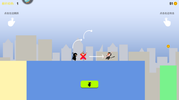 4、点击左边屏幕即可跳跃,最多可进行二连跳,在遇到小女孩时使用二段跳避开,遇见敌人时点击右边屏幕进行攻击