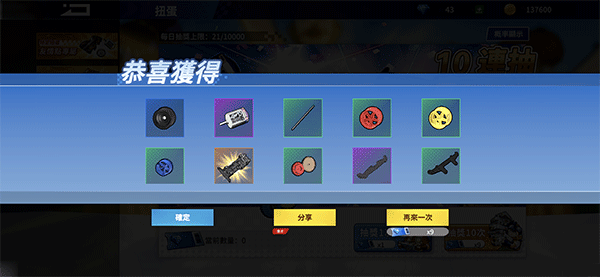 如果有抽到紫色以上的马达或多一点的平衡杆或导轮更佳,但非必要,因为我们后面都可以透过任务、签到或金币商城机率购入。