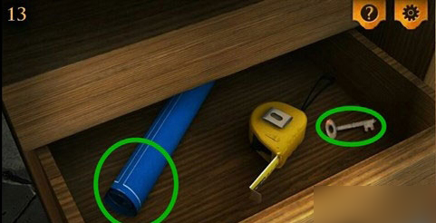3、再用撬棍打开右侧桌子右下方的抽屉,从抽屉里拿到一张蓝图和钥匙;