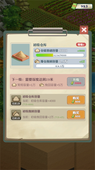 4、解锁你的初级仓库,可容纳更多沙土容量。
