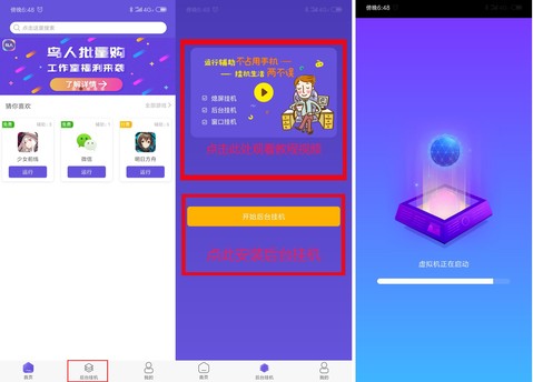 后台挂机模块是鸟人助手发布的最新功能,可以在您的手机里创建一个完全隔离的空间平时您用手机运行辅助时,游戏必须置于手机前端,此时您把游戏切到后台,游戏、辅助就暂停了,没办法用手机做其他事当您开启后台挂机功能后,您可以运行辅助并把辅助切到后台,游戏、辅助也不会暂停,您可以继续使用手机看视频、聊QQ,甚至还能用一台手机同时玩两三款游戏。