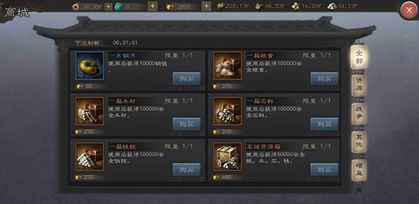 购买是获取资源最快的方式,在商城中,主公们可以花费30元宝购买一担资源,使用后将获得1万对应的安全材料。270元宝能够购买一箱资源,使用后将获得10万对应的安全材料。而480元宝购买的高阶资源箱,在使用后将获得5万安全粮、木、石、铁。而在势力商店中,花费10个春秋布币就能购买中级资源箱,其内有2万四种安全材料。