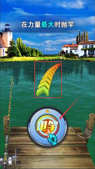 稍微简化了现实中的一些步骤。而钓鱼的第一步便是抛竿。如何抛竿?这可不是简简单单的随手一扔,在生活中,扔出的力道直接影响到你鱼竿的远近和你抛掷的方向。不过在《全民钓鱼2》这款游戏中似乎简化了,抛竿这个技术活变成了反应测试,当我们按下中间的准备按键后,屏幕中间就会出现一条能量条,来回波动的能量条是你要抛竿的力量,当我们按下中间开始按钮,便抛竿成功。