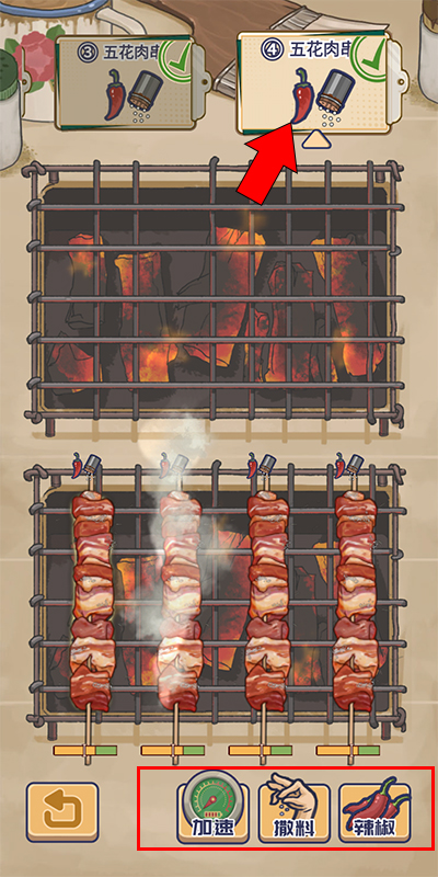 2、接着我们点击后方的烧烤原材料,将其放置在烧烤台上,并根据顾客需求为其加辣加调味料