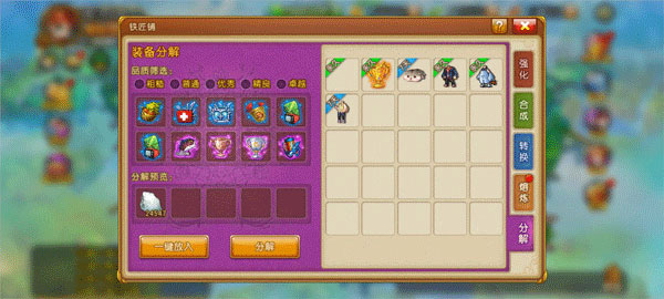 点击主界面的铁匠铺,选择【分解】然后在界面的左边出现不同品质的道具,玩家可以选择这些道具进行分解,也可以点击一键放入,每次最多可分解10个道具!