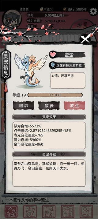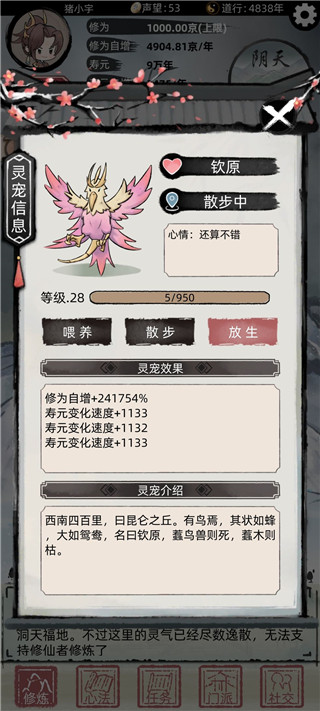 ·散步:提升灵兽心情,需100年回归,期间无法喂食