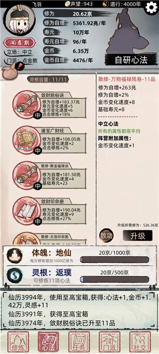 ·功法升级修为与体魄升级修为相差不多时,优先点体魄,固灵看情况点