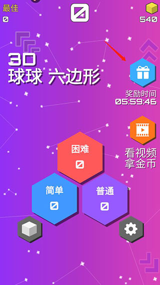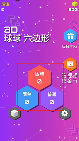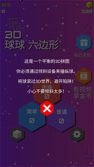 这款游戏叫“球球六边形3D”,听起来就挺有意思的。玩法就是用手机倾斜来滚小球,得控制好角度,别让速度太快失控了。游戏有三个难度模式:简单、普通和困难,新手可以从普通开始练手。目标是把球滚过六边形立方体的多个面,避开出口和陷阱,得分越高越好。
