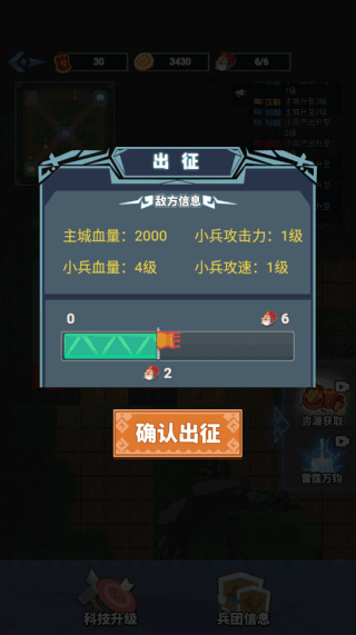 9、小兵攻击力和小兵血量都升到3级,为了刷新新兵,找家兵力弱的进攻他主城。