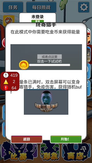 愣子跑酷终寄猎手版是一款up主魔改《地铁跑酷》制作的恶搞跑酷游戏,在这里游戏主角变成了我们愣子哥,因为不小心砸坏了隔壁家胖子的玻璃,被胖子追赶,帮助他躲避胖子的追赶就是你的游戏目标,尽可能的跑的越远越好,同时还要小心路上的各种障碍物,尽量攒够金币用来购买道具泡面,帮助你更好的跑酷!此版本新增加了终寄猎手模式,此模式中你需要吃金币来获得能量,当能量条蓄满时可以变身终寄猎手,免疫一切伤害并且随机获得buff,听起来是不是很有趣呢?还不赶快下载体验,帮助我们的愣子哥跑得更快更远吧!