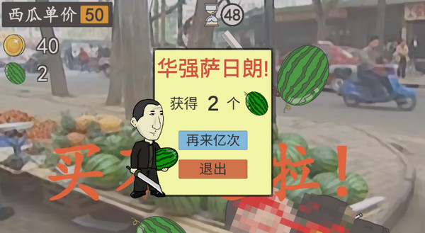 有一个男人前来买瓜,他叫刘华强……这个火爆全网的片段出自2003年孙红雷主演的电视剧《征服》,而B站UP主火山哥哥将其做成了劈瓜小游戏——正是这款华强劈瓜(拼音HuaQiangPiGua)。原版视频片段中刘华强与西瓜贩子买瓜的经历在这变成了水果忍者模式,玩家需要在一定时间内滑动屏幕,劈砍西瓜或者钱袋,注意不要误伤了西瓜贩子哦!不然就会触发“华强撒日朗”直接结束游戏。正确的通关玩法应该是小心注意钱袋子和西瓜,如果西瓜砍多了会因为钱不够而买不起,如果只拿钱袋子,那西瓜的数量就会上不去了,因此两者都要小心注意,同时还要避免误伤西瓜贩子导致游戏结束,坚持60秒,看看你能买多少西瓜吧~