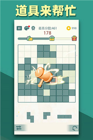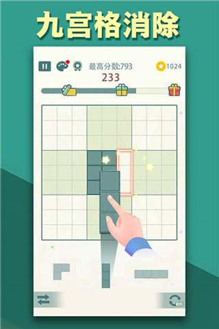 这不是浓墨重彩的厚重砖块,而是清新简约的七巧板拼图九宫格方块,采用清新简约的蓝绿配色,保护眼睛的同时缓解压力,非常适合喜欢益智休闲方块游戏的你!将方块拖进棋盘中,使各个不同形状的方块能够填满棋盘中的任意一个九宫格或者行列后消除得分。如何合理放置方块获得更多的消除分数,需要保持聪明的头脑和清晰的思路。快来试试看吧!更新日志