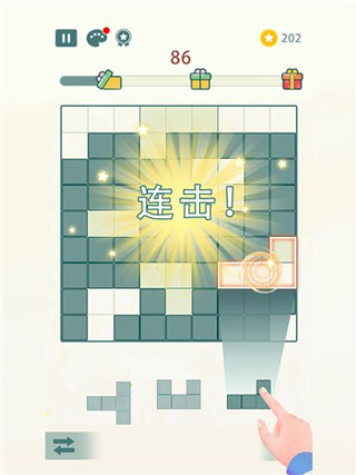 3、益智大脑,炫酷消除:经典七巧板玩法,将方块拖入棋盘中拼接消除,消除特效华丽炫酷,闪爆你的眼球。