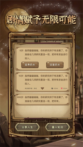 魔幻异世转生模拟器是一款非常不错的Roguelike类文字冒险手游,游戏从本质上讲应该算作是异世界篇的续作,在游戏中,玩家可以体验不同的魔幻异世人生,并且通过不同的天赋属性来丰富异世的冒险旅程。进入转生之前,玩家可根据自己的需要选择最少三条天赋,并且分配20点基础属性点给力量、智慧、体质、家庭四个基础属性。每个属性数值的高低,会在游戏中得到不同的发展。以四个基本属性为依托开展剧情,为玩家的剧情属性:等级、敏捷、魅力,提供剧情来源。属性值越高,所触发的剧情就会越精彩。同时魔法世界还加入了体力玩法,玩家每一年都会获得100点体力,当到达不同小岛或大陆的时候,玩家经历的剧情会消耗对应体力值,直至体力消耗完全,当年的剧情结束进入下一年。体力值的加入让玩家能够更加真实的体验到魔幻的的历练。快来下载吧,体验不一样的全新人生!