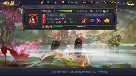 亲密度除了红颜宠幸有一定几率提升外,还可以通过沐浴获得稳定的提升。