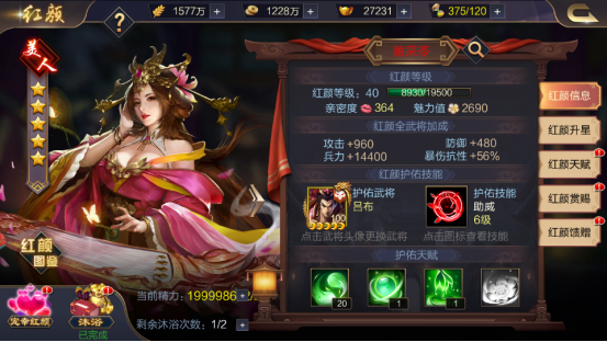 红颜有4个天赋技能,红颜等级1-20-40-60级分别开启,天赋技能只对当前护佑的武将有属性加成,最高可升至20级。