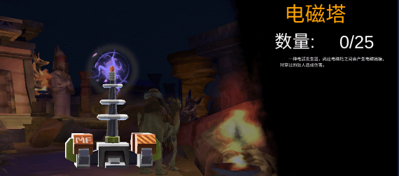 电弧发射器,放置后会持续一段时间产生电弧对敌人造成伤害,两座电磁塔之间还会产生电磁连接。电磁塔有点类似炸弹陷阱,当敌人进入他的触发半径之内的时候才会突然出现,然后攻击敌人,一个位置恰当的电磁塔将给敌人造成巨大伤害。