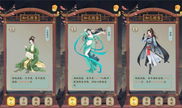 2、除了这三位开局知己,这里再推荐几个非常强的知己作为前中期选择对象,分别是小家碧玉、青蛇、神捕。想要迎娶小家碧玉需要家里仅有一个产业,对于前期来说一年几十万的额外收入非常关键。