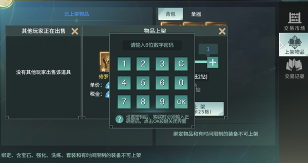 因游戏中无单独交易系统,因此交易行增加了道具上架加密功能,道具上架的时候可以设置6位数字密码,购买此道具的时候就要输入相同的密码才能购买,不知道密码的玩家是无法购买此道具的,这样再也不用担心东西被抢啦!只要告知好友密码就可以了。