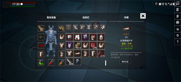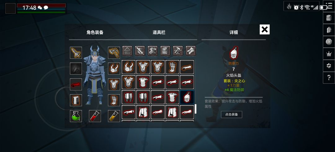 装备栏与背包,点击右上角!!!然后点击背包图示打开,在探索模式中你的背包基础格数是10,拖动装备或药剂到左侧格子中装备,拖动装备或道具到背包界面外把它丢到地上