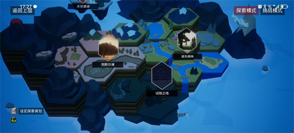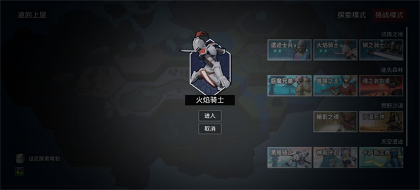 挑战模式是擂台战,奖励特殊货币荣誉,和特殊装备,稀有道具。通关挑战模式解锁下一张挑战模式(如果你先在探索模式中击败了boss那么它的挑战会自动解锁)。开局先打探索模式。