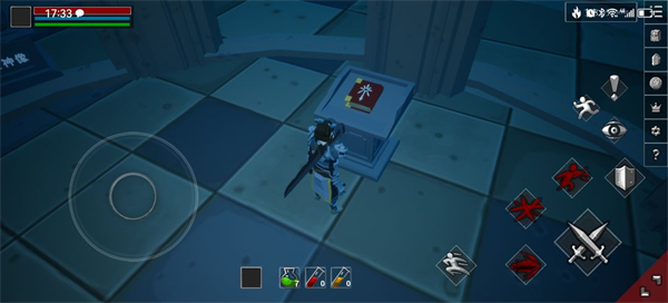 出生点直走有一本书点感叹号交互打开战斗地图。战斗分为探索模式和挑战模式,探索模式是地牢/伪开放式地图,在地图中你只能通过随机出现的传送阵和击败boss后的传送阵回到基地。在一次探索中击败所有boss后解锁下一张地图。奖励魂,装备,药剂。