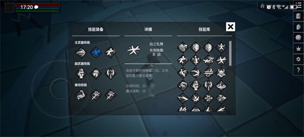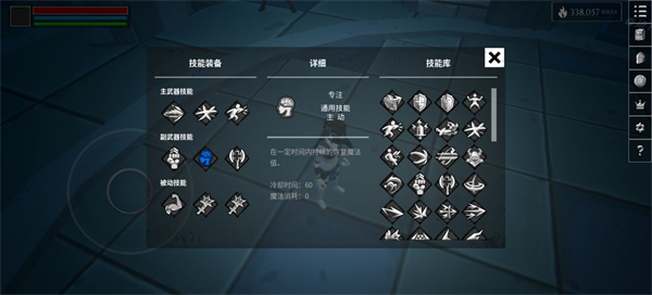 点右上角三个!后点击第四个格子打开技能面板,把右侧技能拖动到左侧装备。