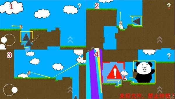 图1来到这一个陷阱旁边,稍微向前多走一点,然后迅速的返回,引出第1个陷阱中的三角形机关,迅速的返回躲避。图2在靠左的位置落下,之后迅速的上升躲避三角机关。
