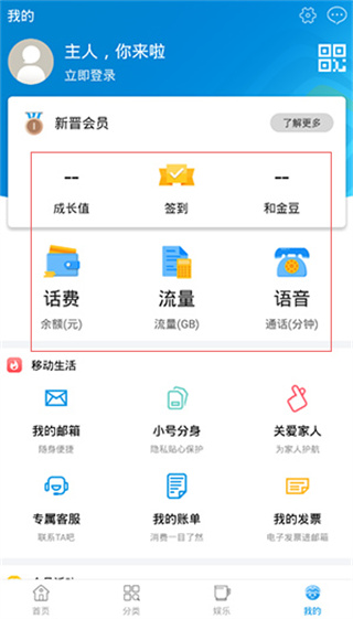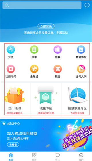 1、在本站下载安装和悦会app,在手机桌面运行软件,可以看到有首页、分类、娱乐、我的四个板块,在首页,可以发现有充值、账单、套餐、热门活动等;