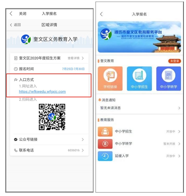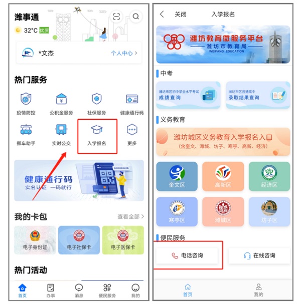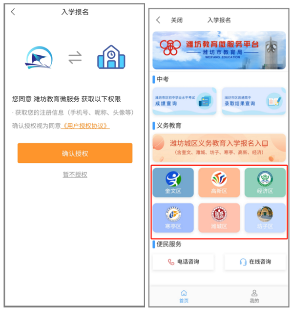 2、选择“潍事通”APP首页的“入学报名”按钮,进入“潍坊教育微服务平台”页面。如有招生报名相关的疑问,可点击“潍坊教育微服务”—“电话咨询”按钮进行咨询。