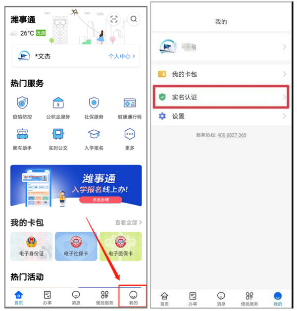 1、打开“潍事通”后,选择右下角“我的”,点击“实名认证”按钮,进行实名认证。