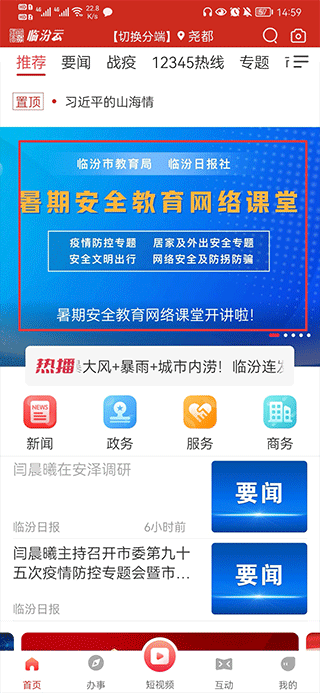 1、打开临汾云app,在首页中点击进入暑期安全教育网络课堂