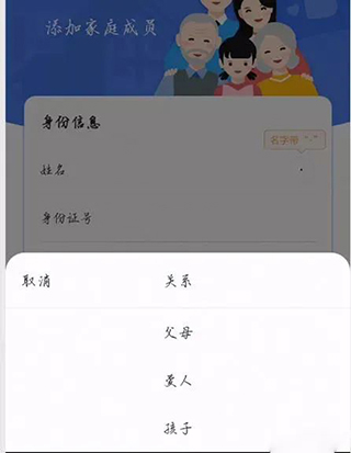 4、输入需要添加的人员信息,选择关系“父母、爱人、孩子、其他”;