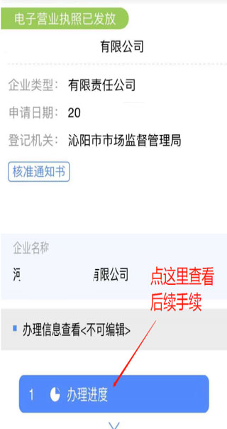 如果显示“电子营业执照已发放”,那么恭喜您,您可以到登记窗口领取纸质版营业执照了!点开公司名会看到您之后需要办理的手续,请认真查看(操作界面见下图)