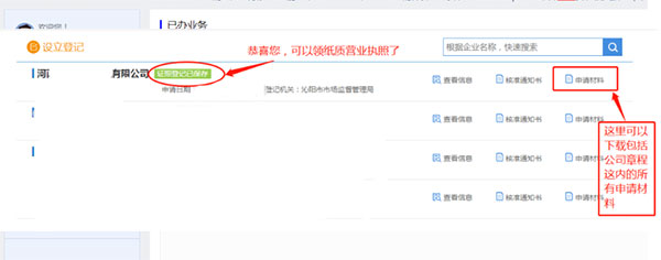 找到您申请设立的公司名称,如果名称后面显示的是“电子营业执照已发放”,那么恭喜您,您可以到登记窗口领取纸质版营业执照了!点开公司名会看到您之后需要办理的手续,请认真查看。另外,点击公司名称后面的“申请材料”,可以下载包括公司章程在内的所有申请材料,如有需要,请自行打印出来(银行开户需要章程)。