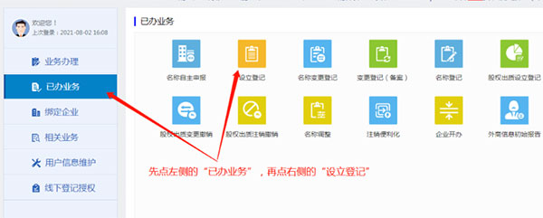 如果上述的步骤中没有找到您提交的业务,那么大概率是通过了,请点击页面左侧的“已办业务”,再点击右侧的“设立登记”(操作界面见下图)
