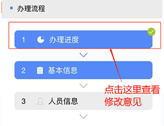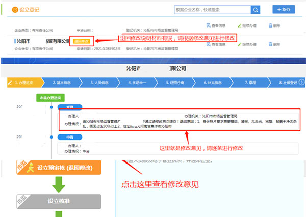 一是委托代理人登录“掌上登记”APP,点击“设立登记”,如果显示“退回修改”,请点击公司名,进入下一步,点击“办理进度”,查看审核人员出具的修改意见,在电脑上逐条进行修改,修改完成后再次提交,等待审核(操作界面见下图)