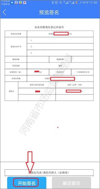 8、签名,输入验证码,检查确认输入的企业信息和个人信息。