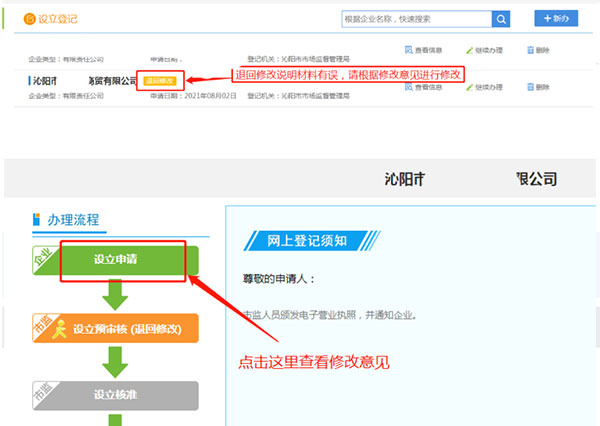 二是委托代理人使用电脑登录全程电子化服务平台,点击“设立登记”,如果您要查看的公司名称后面显示“退回修改”,说明您提交的材料有误,请点击公司名,再点击页面左侧的“设立申请”,会显示审核人员给您写的修改意见,请逐条进行修改,修改完成后再次提交,等待审核(操作界面见下图)