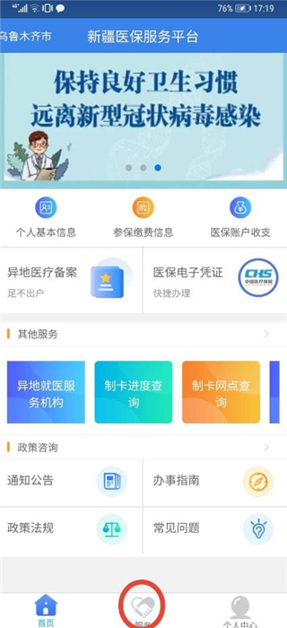 第一步,登录,左上角确定统筹区“乌鲁木齐”,点击“服务”。