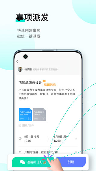 1、多端快创:支持多端快速创建2、日程可协作:任务派发微信/飞项协作人
