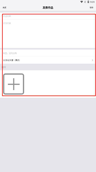 2、在发表作品页中,输入作品名称、正文内容,选择标签,添加想要发表的图片就可以发布作品啦!