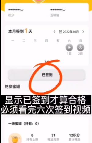 8、签到成功后即可获取积分,当够10个积分记得复投购买一个一级蜜罐,学会复利倍增获取更多的积分。